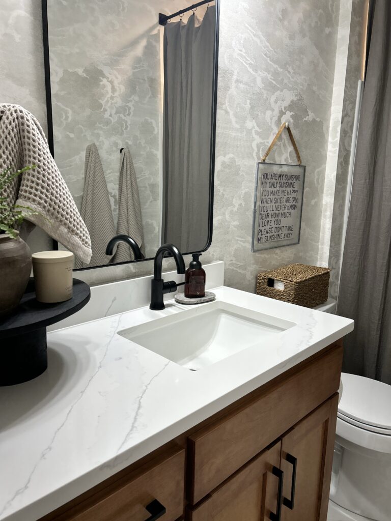 One of the most impactful updates in this powder room design was the bold wallpaper. Even though the palette stays neutral, the pattern creates depth and visual interest — especially important in a windowless powder room.